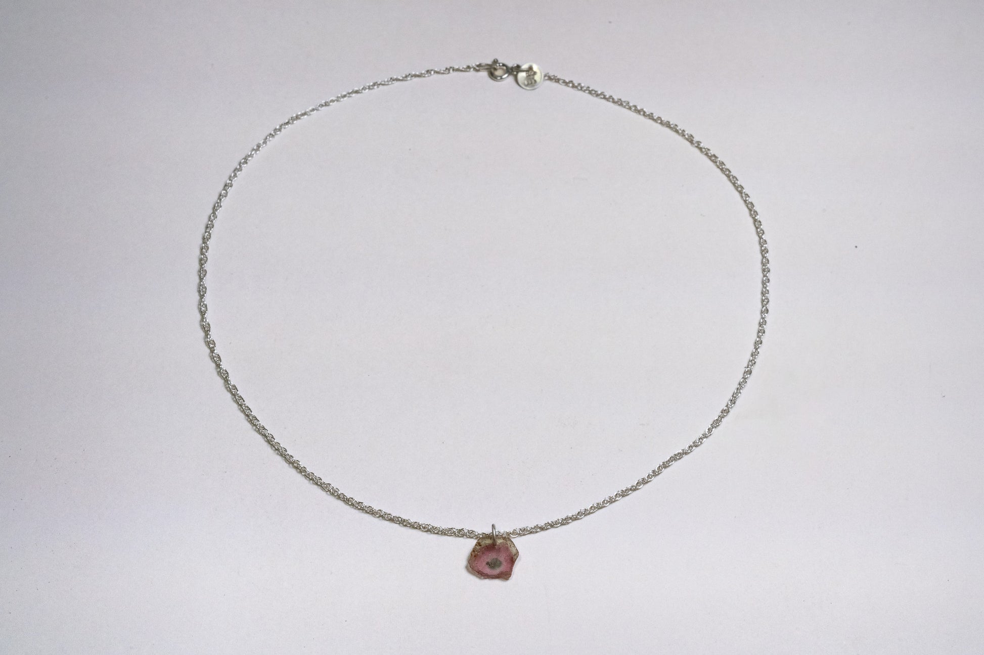 This necklace features a single pink tourmaline slice, its translucent blush center surrounded by natural crystal edges. The delicate pink tones and organic texture make it a timeless, feminine piece. Hung on a sterling silver chain and perfect for layering or wearing solo.